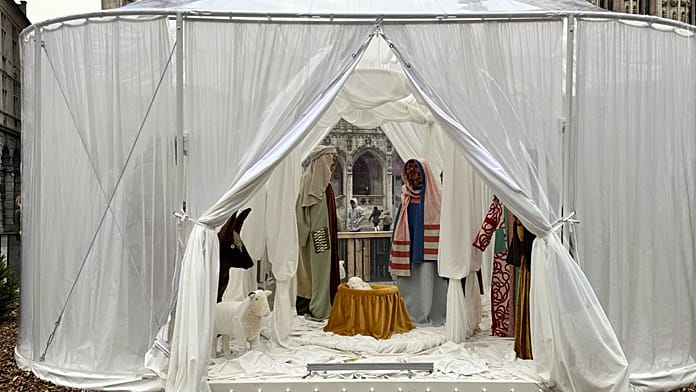 El nuevo diseño de la artista de origen alemán Victoria-Maria Geyer fue aprobado tanto por la Iglesia Católica local como por el Ayuntamiento de Bruselas. Geyer, que se definió como católica, elaboró las figuras del nacimiento con tela reciclada y omitió rasgos reconocibles, con la esperanza de que “todos los católicos, independientemente de su origen o procedencia, puedan identificarse” con la historia bíblica del nacimiento de Cristo, dijo.